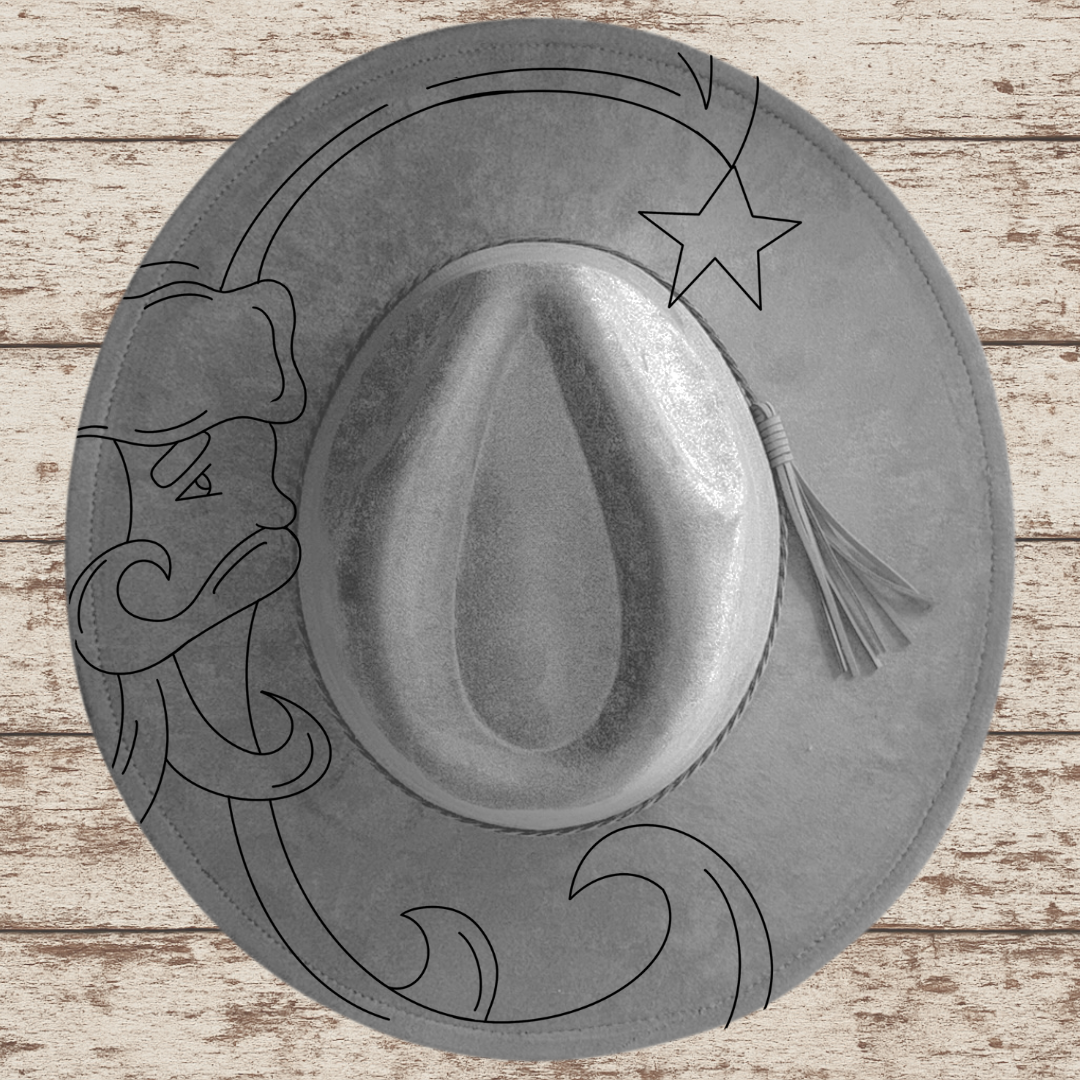 This wide-brim vegan suede hat captures the charm of a classic holiday dreamscape. Laser burned with a swooping crescent and vintage Santa silhouette, the design comes to life in warm Hat Palette hues — snowy cream, bold red, golden yellow, and soft peach — like a storybook night dusted in magic.